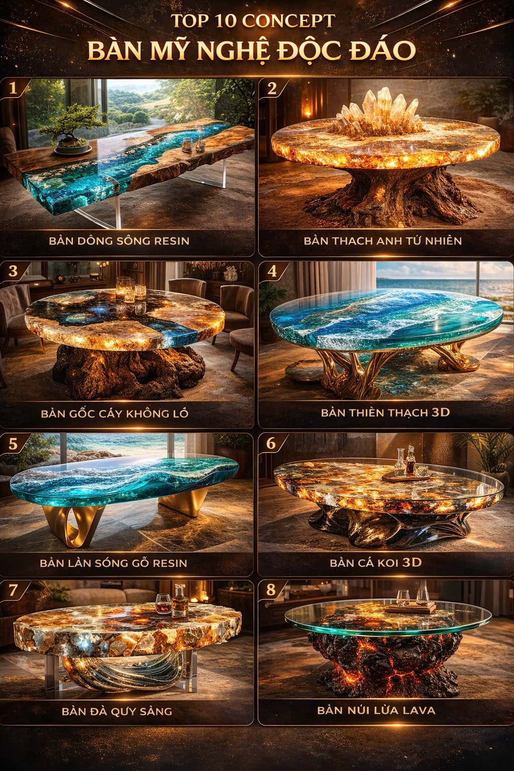 Bộ sưu tập 10 concept mô hình 3D ấn tượng cho thương hiệu Việt: ly trà sữa khổng lồ, cổng cafe, tô phở 3D, bánh mì 3m. Concept bàn mỹ nghệ cao cấp với resin dòng sông, thạch anh, cá koi 3D. Giá từ 60 triệu, thời gian 15 — 45 ngày.